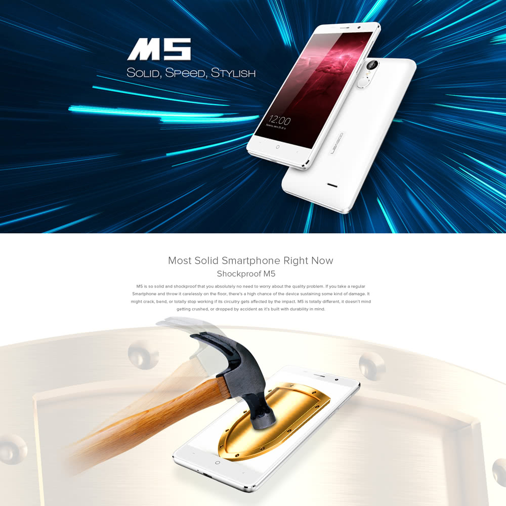 56,99 USD for LEAGOO M5 Smartphone 3G WCDMA MTK6580A 2.5D 5.0 Inches HD 1280 * 720 Pixels Screen Android 6.0 2G+16G 5MP+8MP Dual Cameras Metal Frame Fingerprint Unlock Smart Gesture
